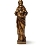 Figura dekoracyjna wykonana z żywicy, przedstawiająca motyw Serca Jezusa, wykończona w kolorze złotym/brązowym z połyskiem. Materiał charakteryzuje się odpornością na warunki atmosferyczne.