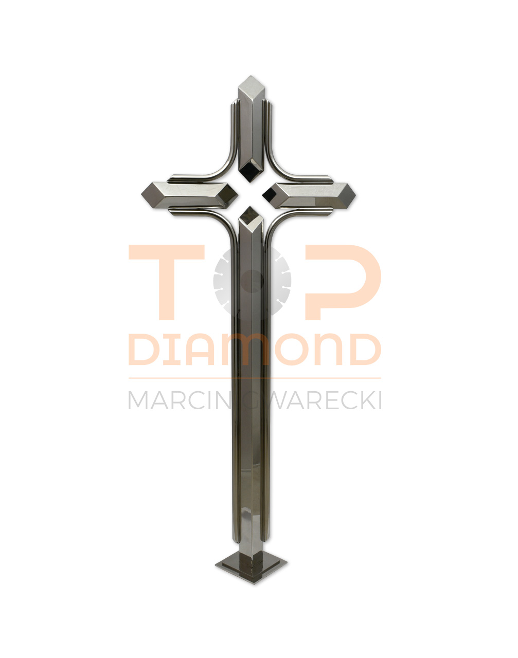 Krzyż stojący wykonany z polerowanej stali nierdzewnej, zbudowany z precyzyjnie ułożonych profili i rurek, które nadają mu elegancki i nowoczesny wygląd.
