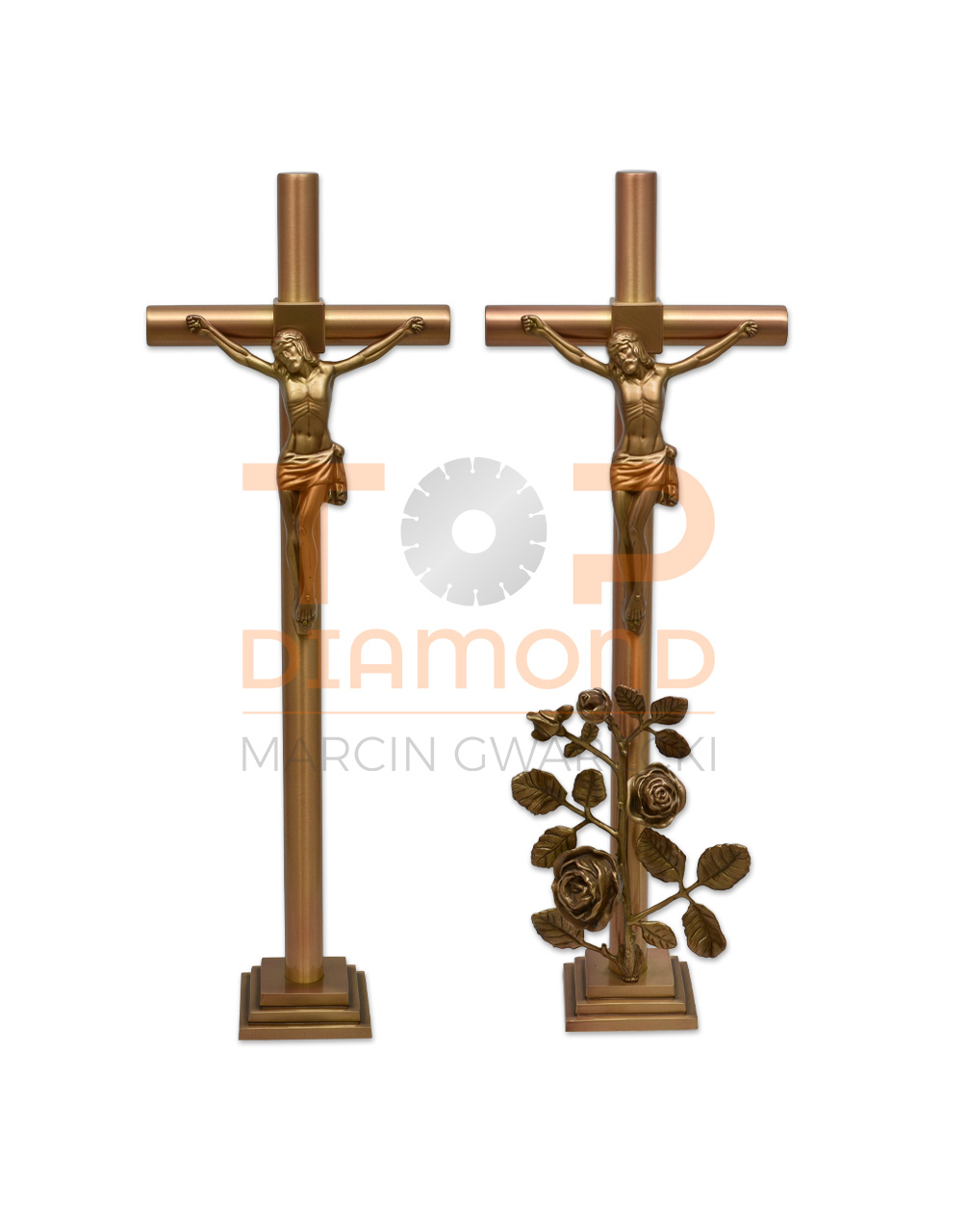 Krzyż z wizerunkiem mosiężny z różą lub bez róży w kolorze włoskiego brązu.