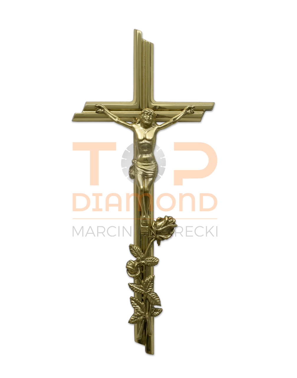 Krzyż z pasyjką mosiężny w kolorze złoto polerowanym z charakterystyczną różą.