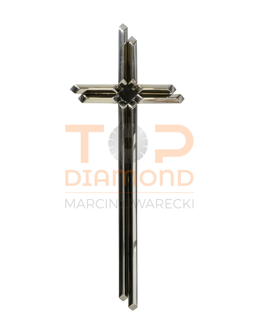Solidny krzyż wiszący wykonany z polerowanej stali nierdzewnej, zbudowany ze sztorcowo ułożonych prętów, co nadaje mu solidny i elegancki wygląd.