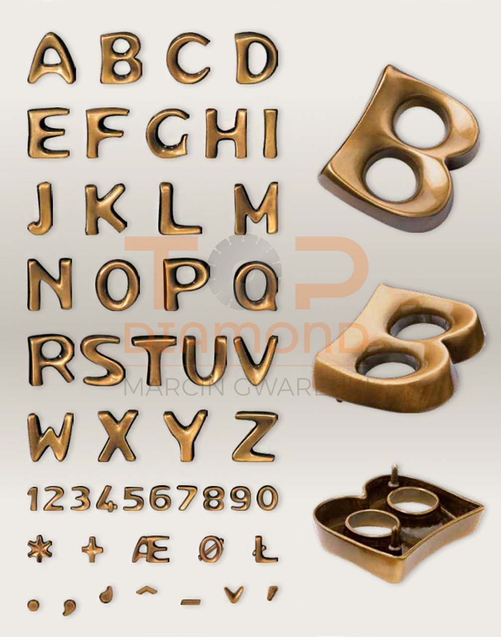 Litery odlewne z brązu pokryte lakierem o bardzo dobrej wytrzymałości i trwałości.