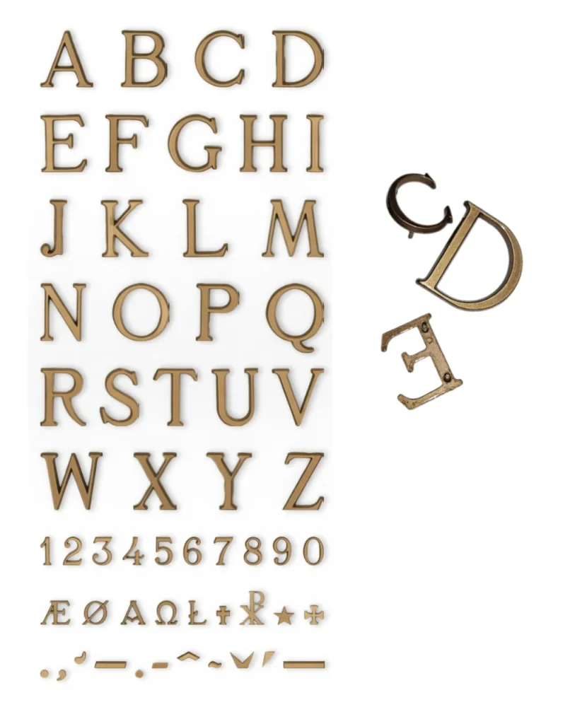 Litery odlewne z brązu pokryte lakierem o bardzo dobrej wytrzymałości i trwałości.
