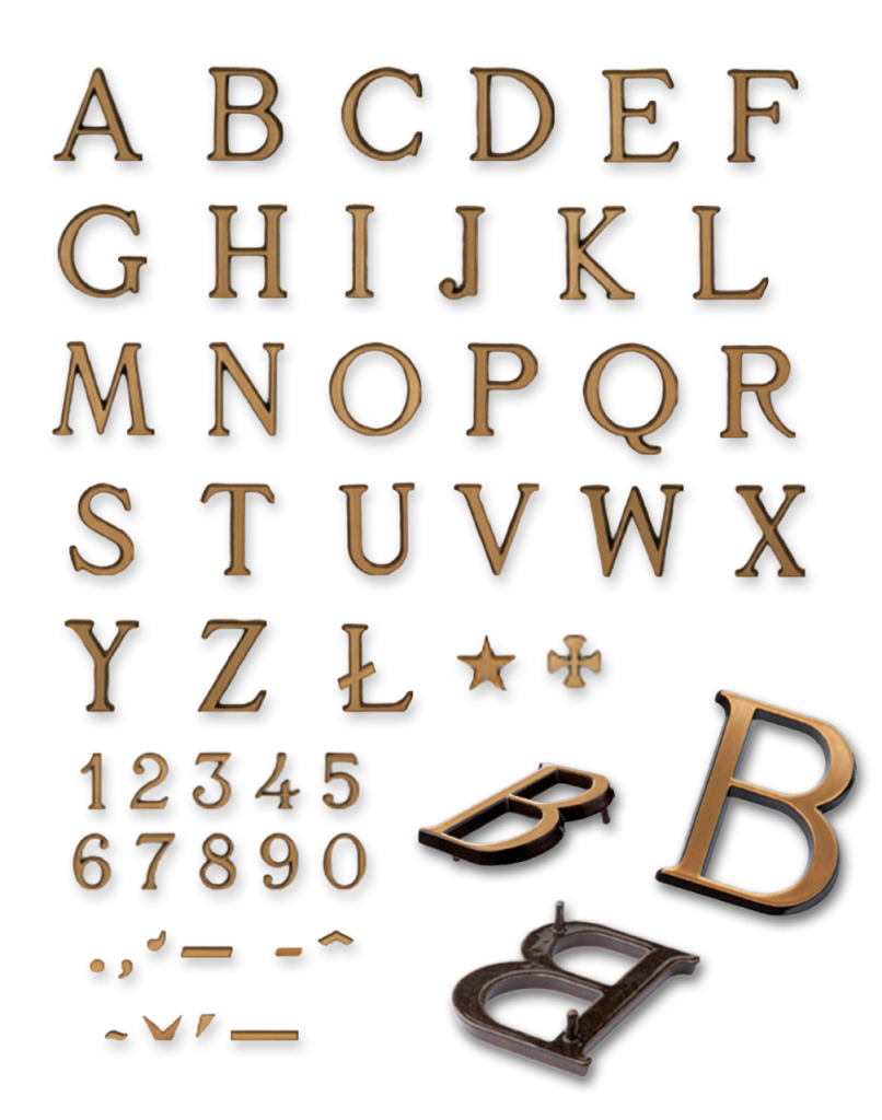 Litery odlewne z brązu pokryte lakierem o bardzo dobrej wytrzymałości i trwałości.